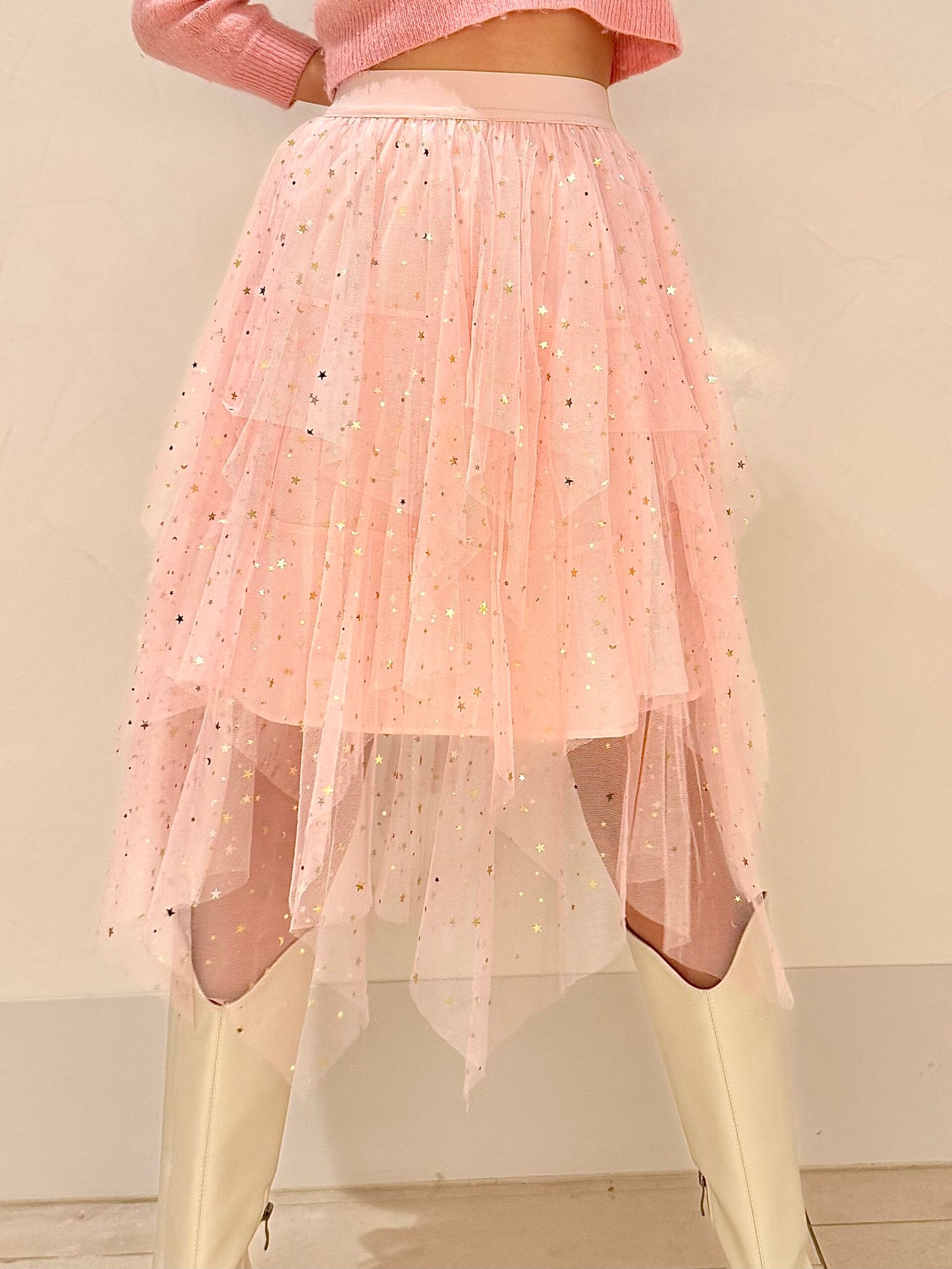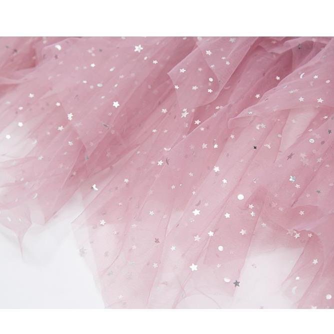 A romantic petal‑layer veil skirt in soft rosé veil, finished with shimmering star‑and‑moon accents—designed to look sculptural in shape yet airy and fluid in motion.