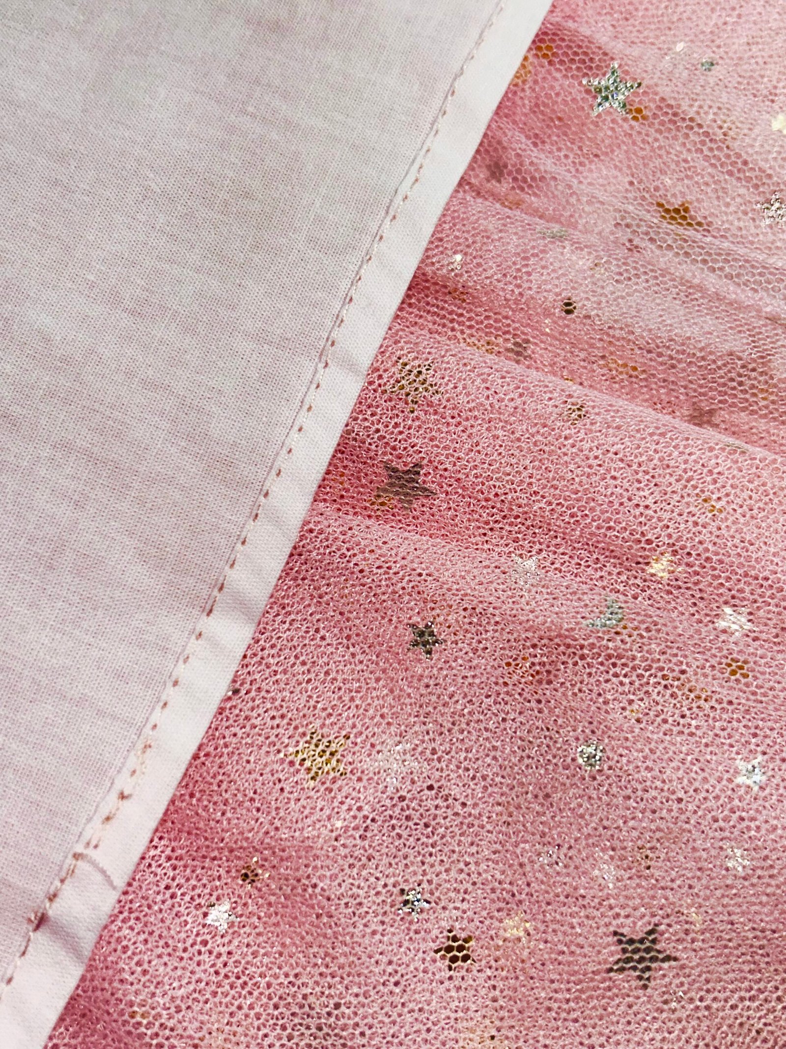 ✔️ Composition – Main veil: layered petal ruffles with metallic sparkle; lining: 60s cotton; finished with a pink elastic waistband.